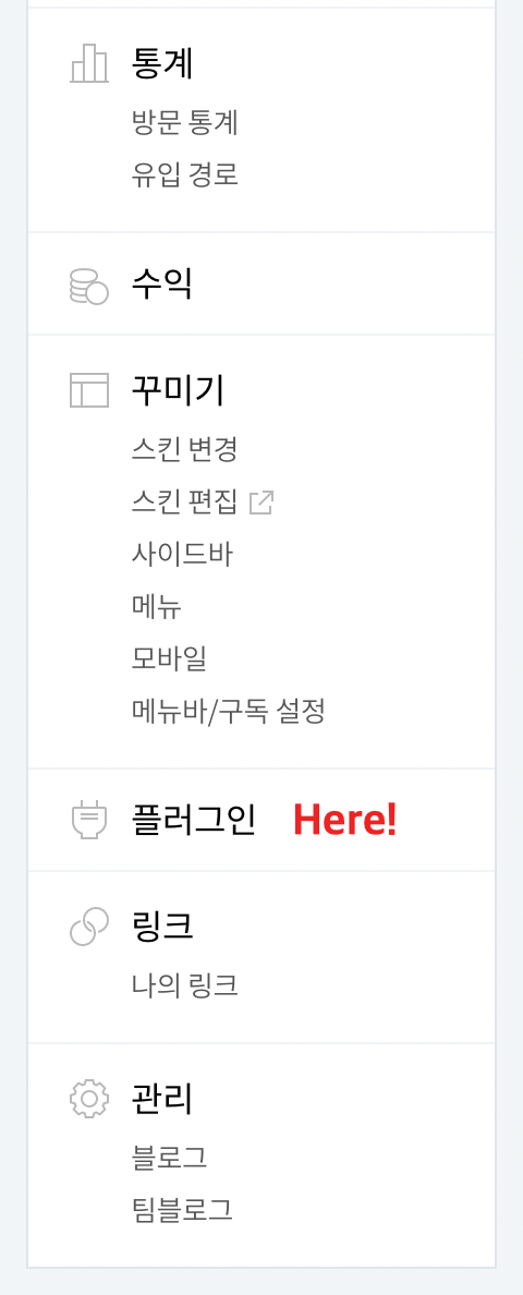 1. 블로그 관리 (설정) 의 왼쪽 탭의 플러그인에 들어가기