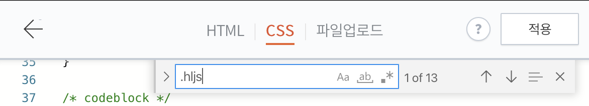- '관리 ▶ 꾸미기 ▶ 스킨편집 ▶ html 편집 ▶ CSS' 에서 기존에 작성된 .hljs 코드를 지우기