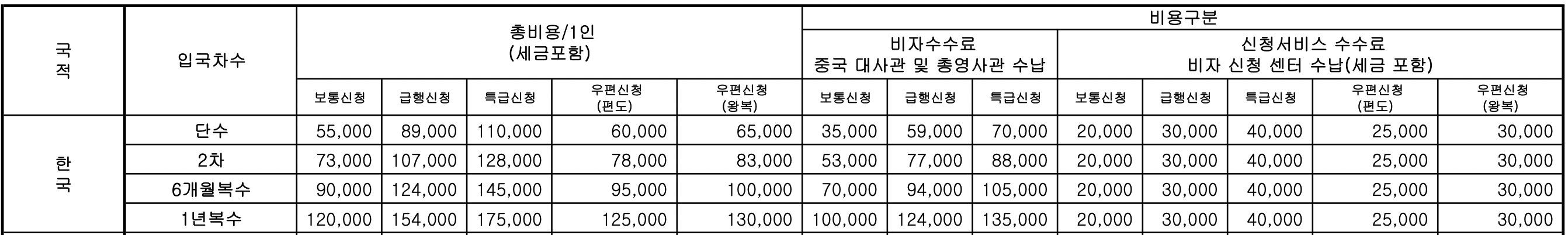 중국 단수 관광 비자(L)의 경우, 55,000₩의 비용이 발생한다. 비자별 비용 내역은 아래의 링크(사진클릭)에서 확인할 수 있다. 비자 대행사에서 100,000₩ 이상을 청구하는 경우를 심심치 않게 보게 되는데 정말 할많하않...