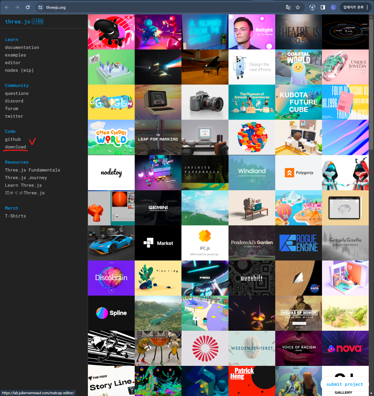 1. Three.js 홈페이지에서 라이브러리 다운로드 (파일 이름: three.js-master.zip)