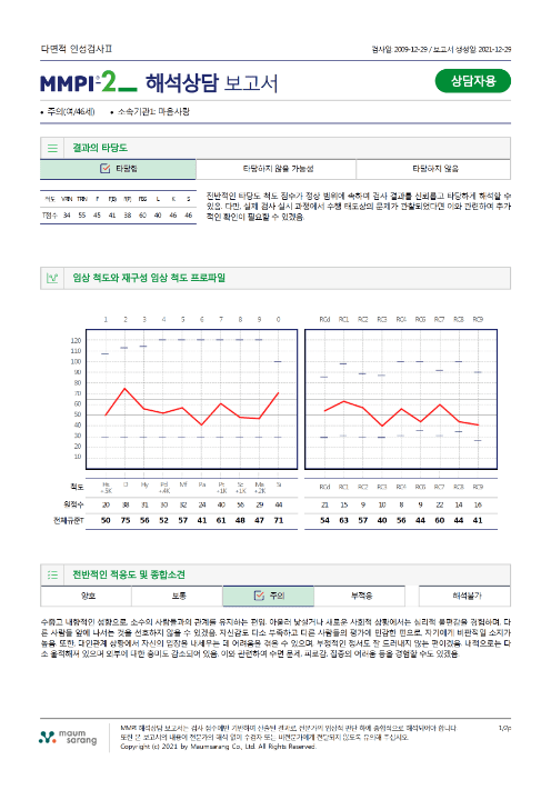 MMPI의 결과는 단독으로 진단을 내리기 위한 것이 아니라, 보다 넓은 평가의 일부로 사용됩니다. 전문가는 이러한 결과를 개인의 역사, 현재 상황, 다른 평가 결과와 함께 종합하여 해석합니다.